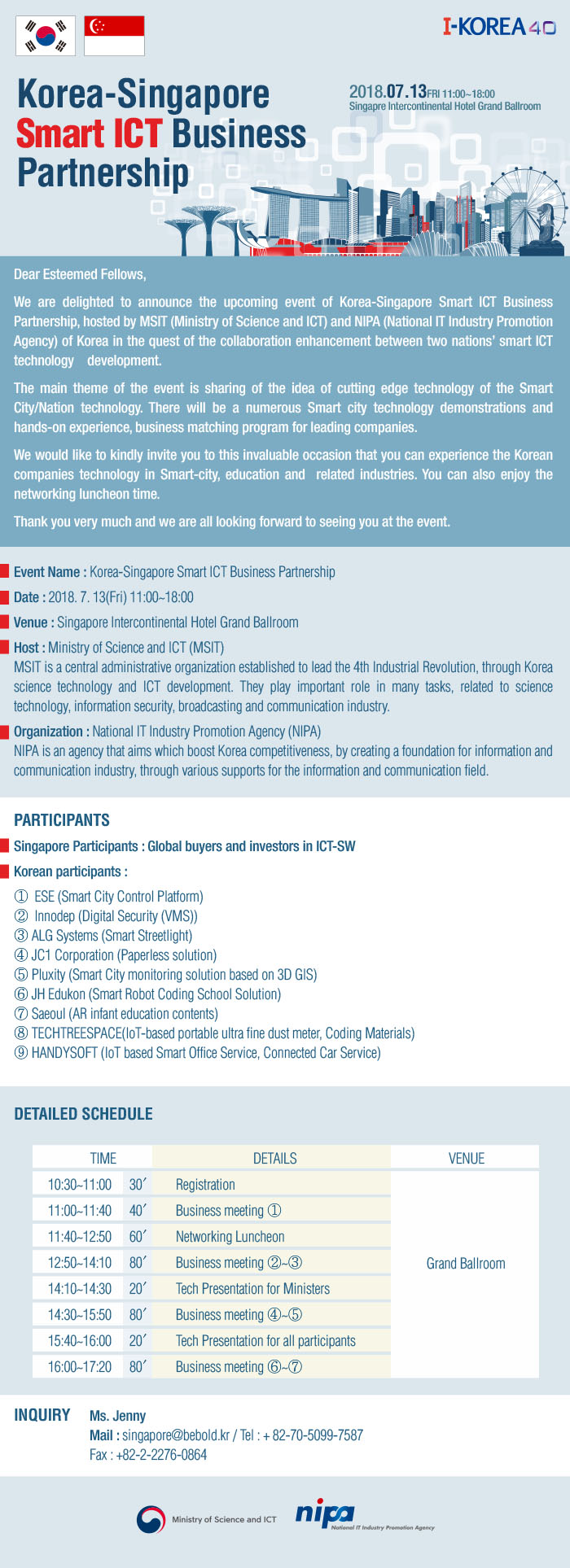 한국과학기술정보통신부 주최 Korea-Singapore Smart ICT Business Partnership 행사 참가신청 안내 페이스북 트위터 작성일: 2018-07-10 작성자: 최고관리자 조회수: 803 참가신청방법 : 첨부 파일을 다운로드하여 참가 신청서 작성 후 아래 메일로 신청서 발송 E-MAIL : singapore@bebold.kr 첨부파일 singapore_edm image.jpg [NIPA] Invitation Letter_0703.pdf [NIPA]Korea-Singapore Smart ICT Business Partnership registration form.pdf
